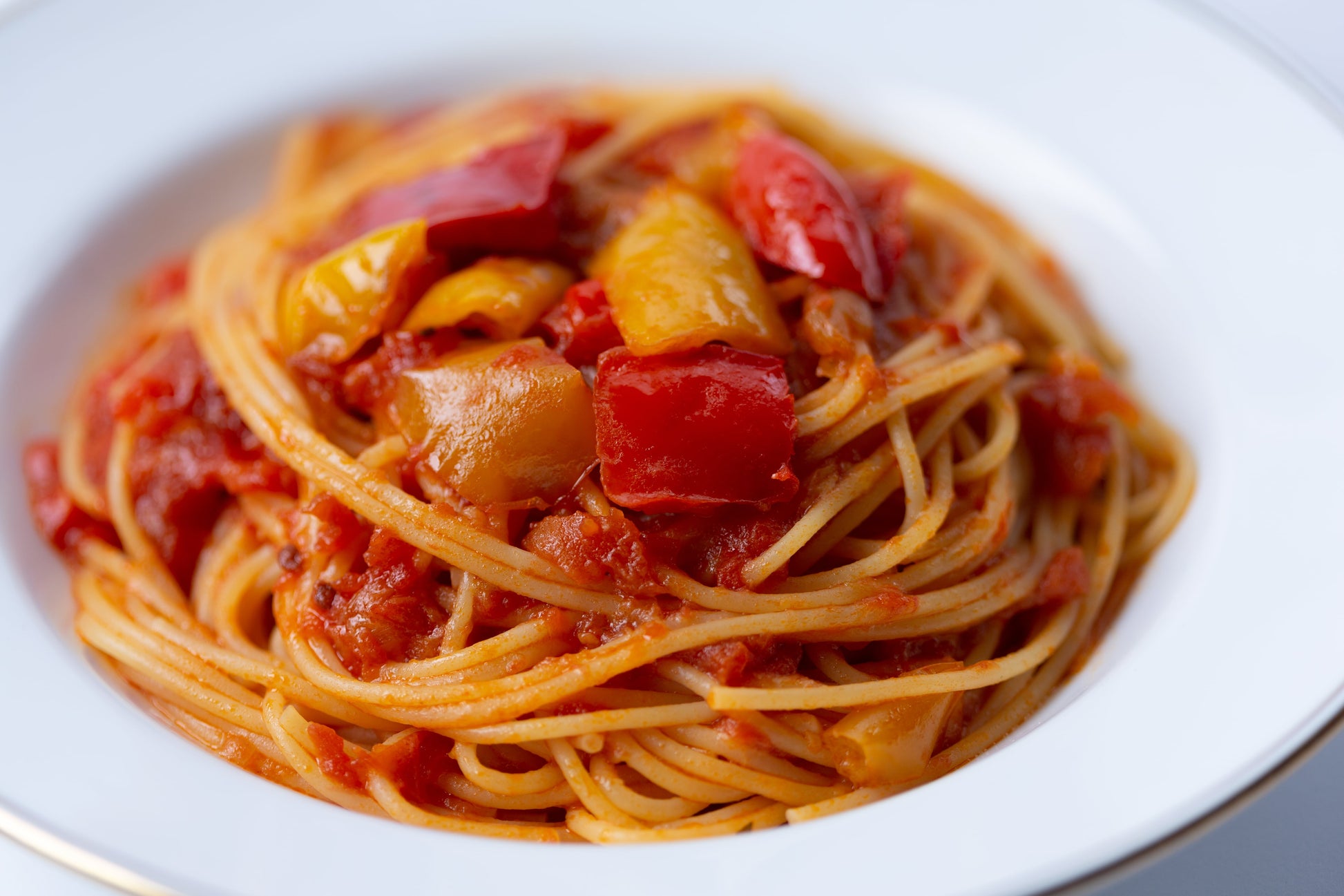「オルトラーナ」は「菜園風」という意味です。肉厚なパプリカを主役に、野菜だけで作った優しいトマトソースです。